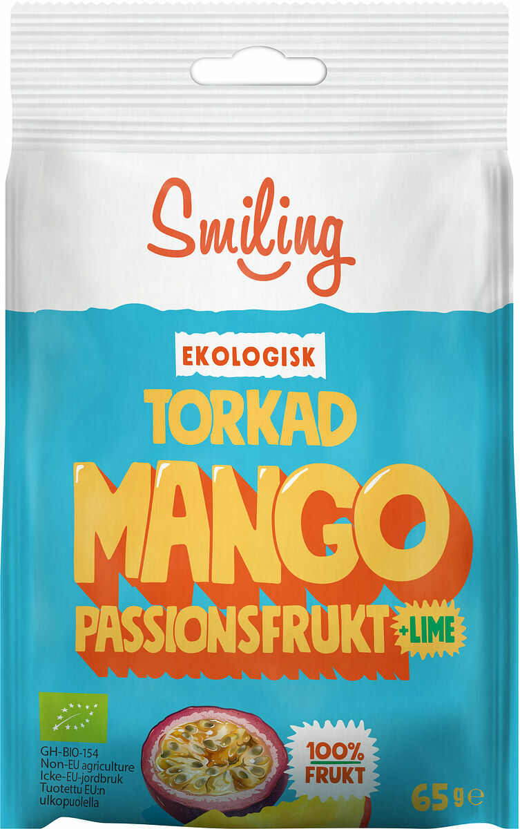 Ekologiska mangostripes med twistad smak! Innan mangon torkas så läggs den i ett bad av passionsfrukt och lime vilket gör att den smakar syrligt innan den blir söt.