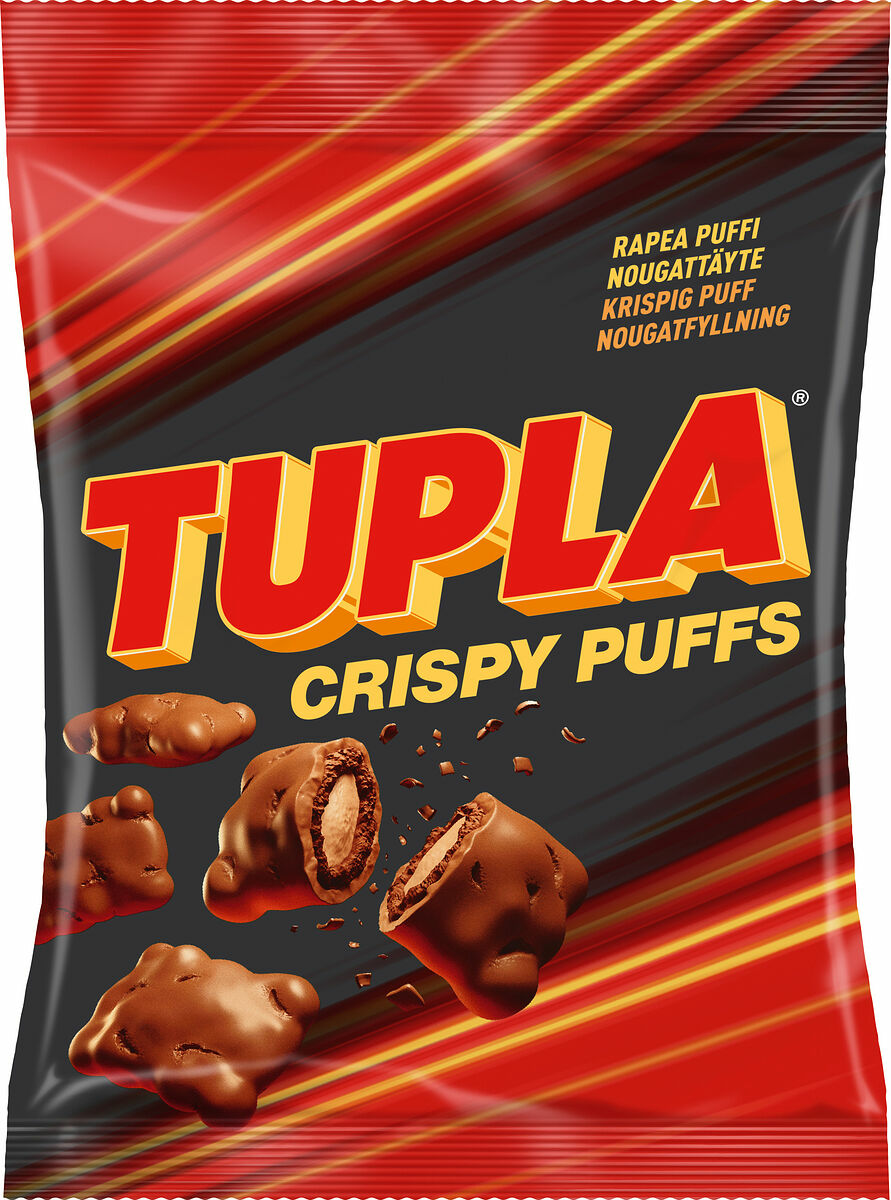 Tupla Crispy Puffs bjuder på riktigt krispiga chokladpuffar med nougatfyllning och dubbla lager ljuvlig mjölkchoklad. Chokladen är certifierad av Rainforest Alliance. Förpackningen innehåller 170 gram.