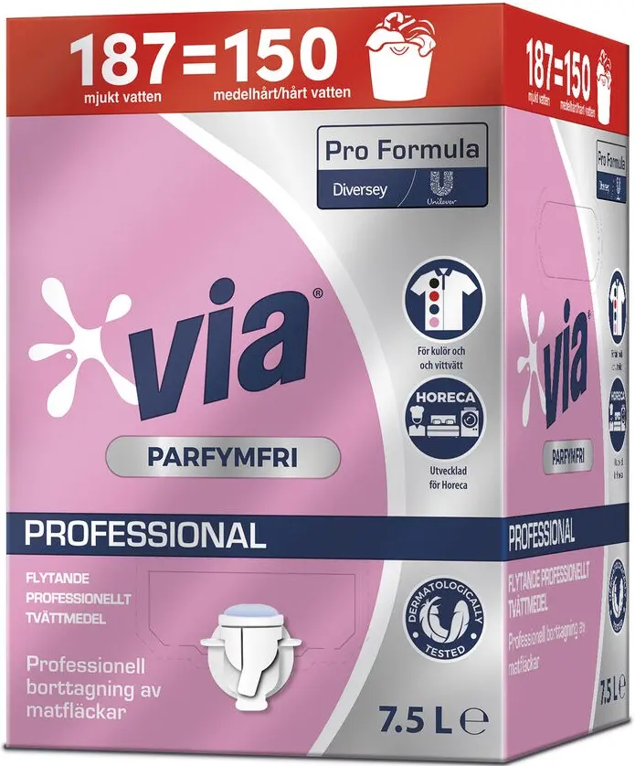 Via Perfume Free är det parfymfria tvättmedlet från Pro Formula, främst lämpligt för färgade tyger, är effektivt mot fläckar och skonsamt mot huden. Dess formel är dermatologiskt testad och 91 % av ingredienserna är biologiskt nedbrytbara (exkl. vatten och oorganiska salter). Det praktiska 7,5 liters Bag in Box-formatet är idealiskt för professionella användare eftersom det är doseringsklart och innehåller stora mängder tvättar.