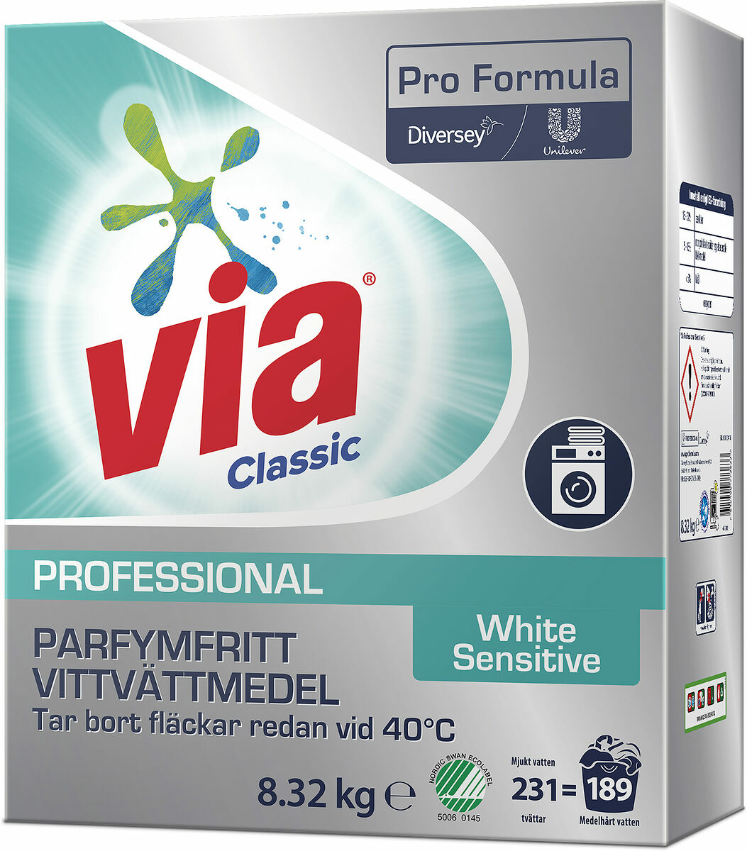 Via White Sensitive är ett tvättpulver som är perfekt för vita tyger och som ger professionell rengöring och tvättkraft. Den är parfymfri och Svanenmärkt.