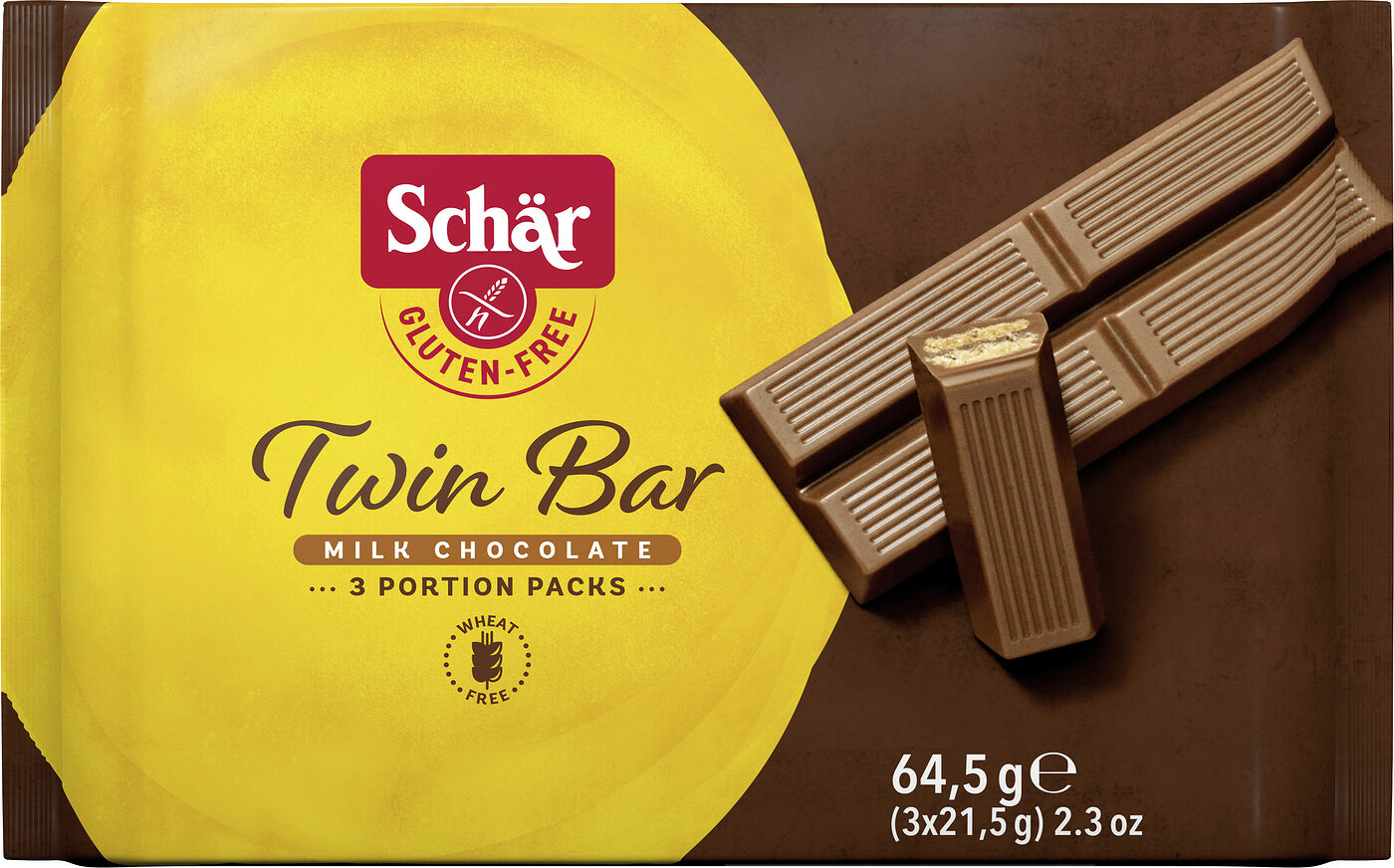 Schär Twin Bar är krispiga och spröda glutenfria rån täckta med mjölkchoklad och med chokladkräm inuti. Först smälter den krämiga mjölkchokladen bokstavligen på tungan, sen följer det frasigt knapriga rånskiktet. Perfekt till utflykten, fikapausen eller varför inte till en mysstund för dig själv! Fri från gluten och vete. Utan tillsats av konserveringsmedel.