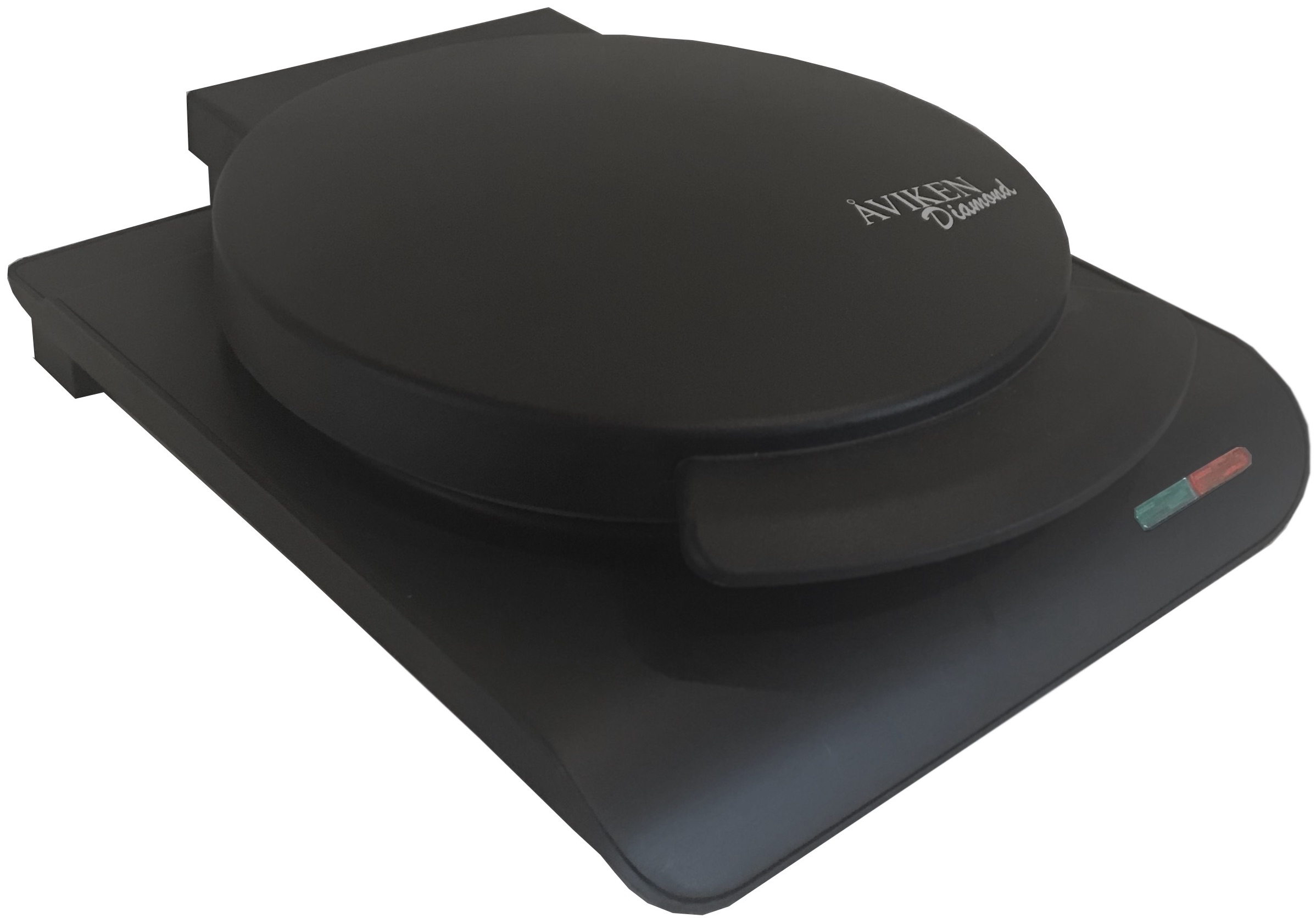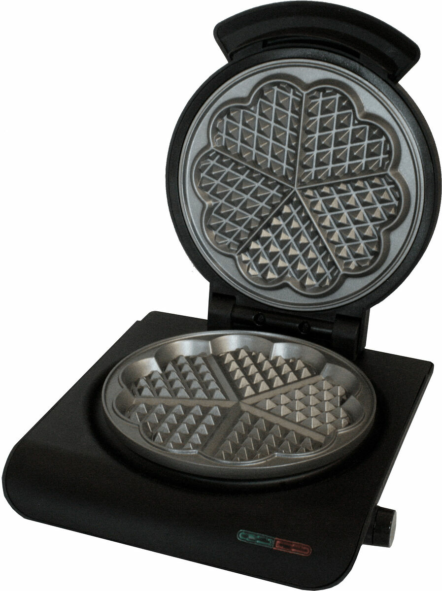 Åviken enkelt våffeljärn i svart sober design. Gjutna plattor i aluminium med mönster av fem hjärtan.