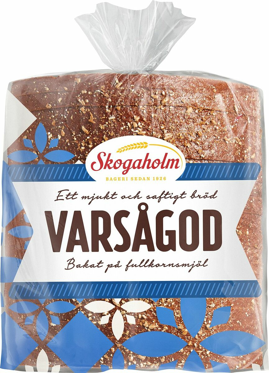 Skogaholms bageri grundades 1926 och har bakat goda bröd sedan dess. Varsågod är ett mjukt och saftigt bröd bakat på fullkorn. Brödet har en perfekt balans mellan det grova och det ljusa. De tunna skivorna smakar härligt med familjens alla favoritpålägg, eller rosta dem frasiga och njut dem med bara lite smältande smör.