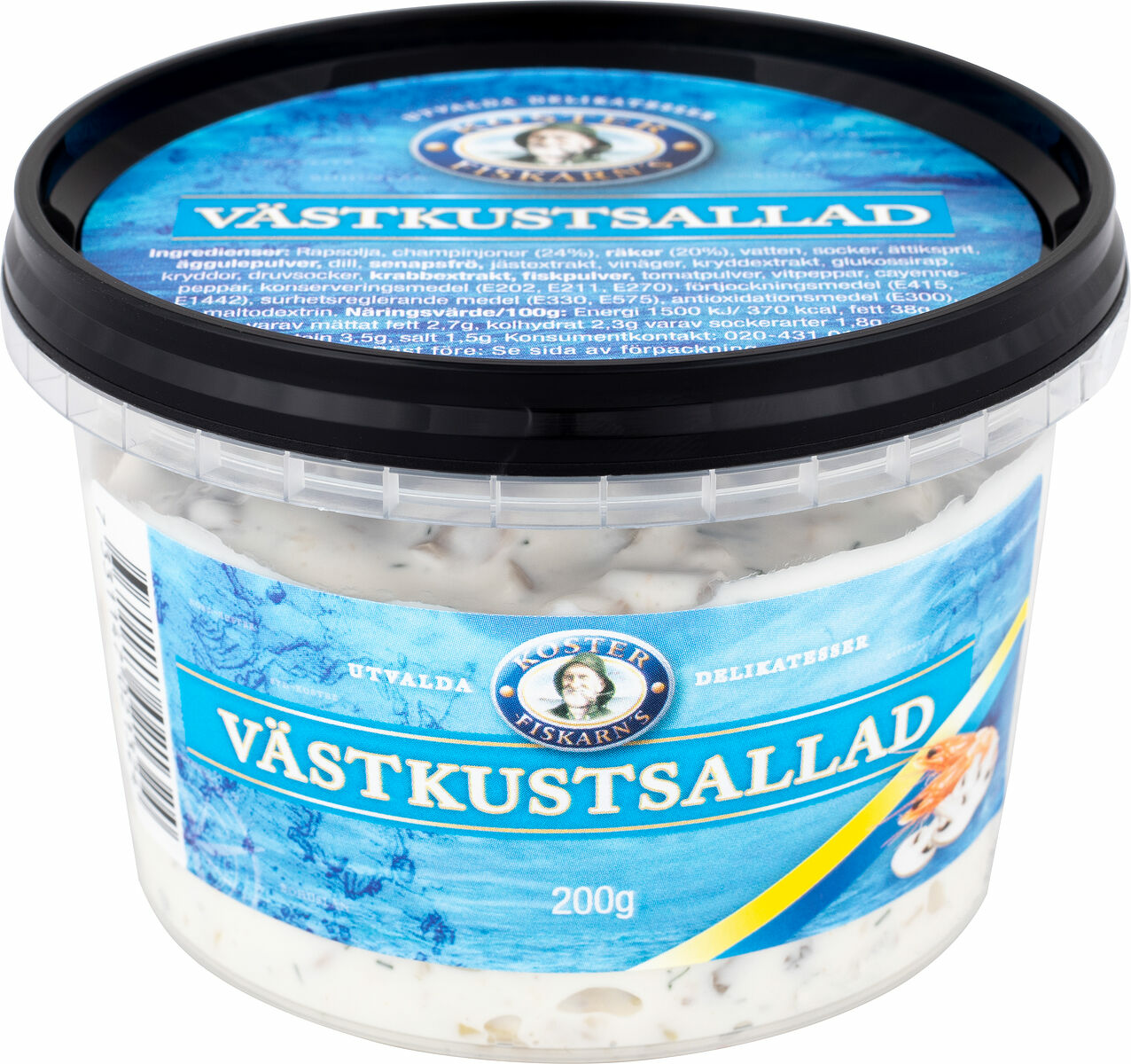 Rapsolja, champinjoner (24%), RÄKOR (20%), vatten, socker, ättiksprit, ÄGGULEPULVER, dill, SENAPSFRÖ, jästextrakt, vinäger, kryddextrakt, glukossirap, kryddor, druvsocker, KRABBEXTRAKT, FISKPULVER, tomatpulver, vitpeppar, cayennepeppar, konserveringsmedel (E202, E211, E270), förtjockningsmedel (E415, E1442), surhetsreglerande medel (E330, E575), antioxidationsmedel (E300), maltodextrin