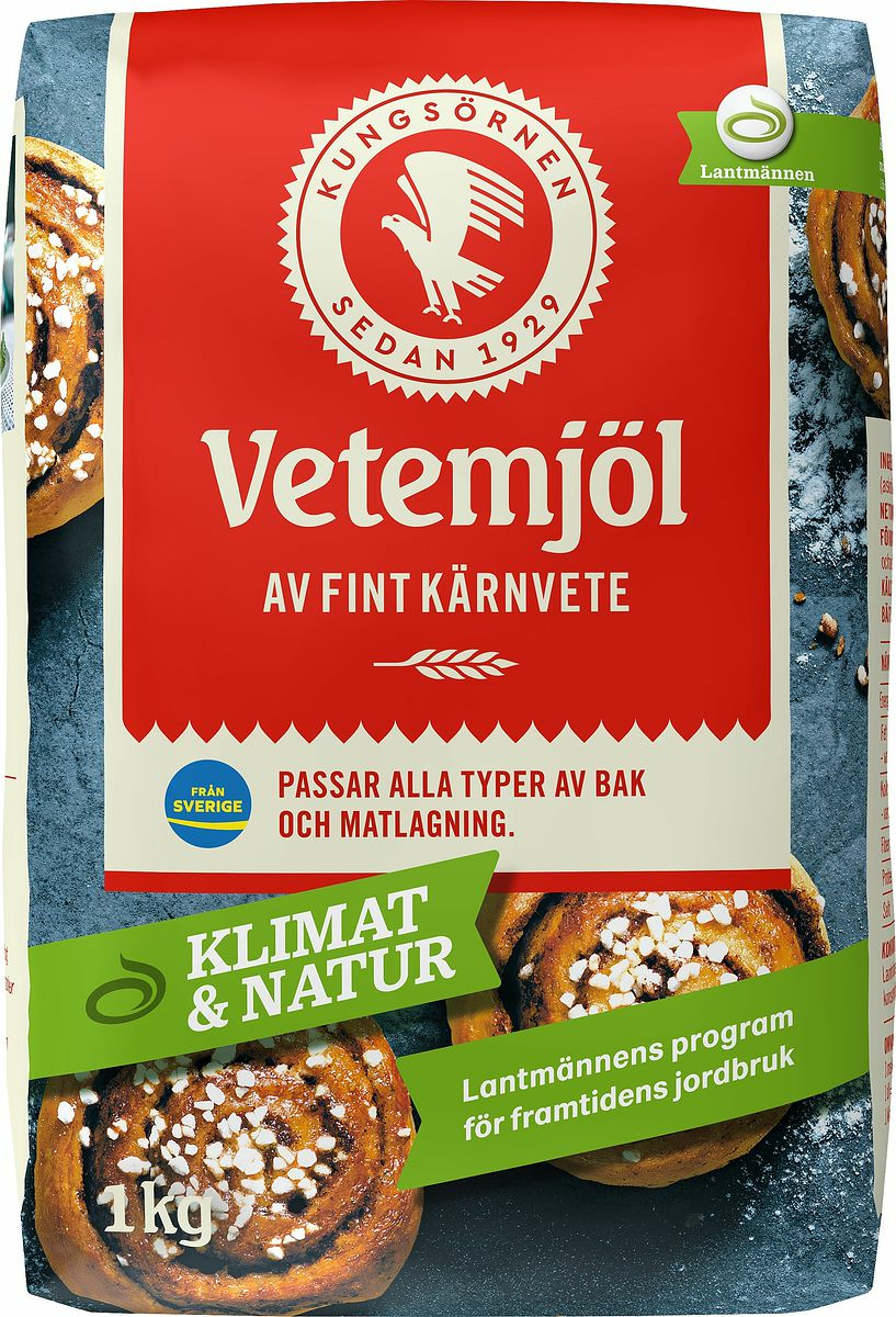 Kungsörnen Vetemjöl från Lantmännen är skapat av fint kärnvete från svenska åkrar. Kärnvetemjöl är malt och siktat på svenskt höstvete i våra egna kvarnar. Du kan använda kärnvetemjöl till allt från mjuka till hårda kakor, redningar, bröd eller bullar. Ett utmärkt allroundmjöl helt enkelt! Detta mjöl är en del av Lantmännens Klimat & Natur odlingsprogram, ett mjöl som är odlat med lägre klimatpåverkan. Det innebär att när du väljer att baka med detta mjöl bidrar du till att Lantmännen kan odla spannmål med mer hållbara metoder.