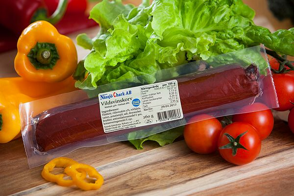 Vildsvinskorv 260 g. Prisad på Chark-SM, smaksatt med chili och paprika. Rökt på gammaldagsvis med enris och alspån.