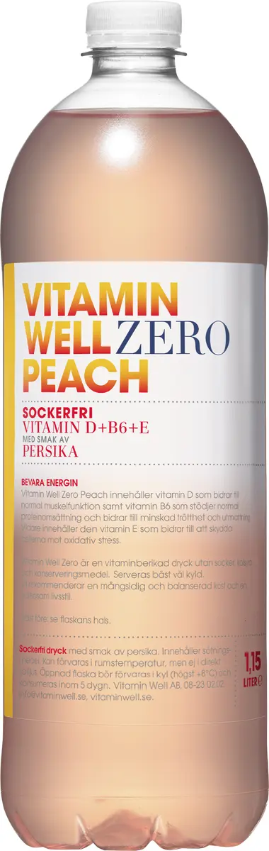 Vatten, surhetsreglerande medel (citronsyra, natriumcitrat), vitaminer (D3, E, niacin, B6, B12, biotin, pantotensyra), smakförstärkare (erytritol), aromer, sötningsmedel (acesulfam K, sukralos), stabiliseringsmedel (pektin), färgämnen (sockerkulör, lykopen).
