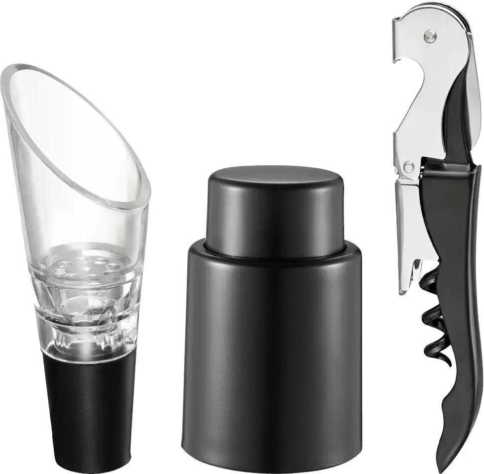 Utforska vårt eleganta vinset – inklusive förslutare, öppnare och hällpip. Perfekt för vinälskare som uppskattar smidig hantering och bevaring av varje droppe.