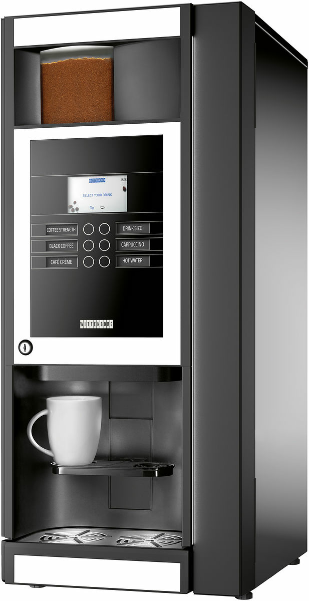 Wittenborg 95 är en kompakt, smidig maskin fylld med bra funktioner. Den har en kapacitiv tryckpanel och en stor färgskärm som möjliggör fasta eller rörliga presentationer. Maskinen brygger kaffe av högsta kvalitet, såväl som espressobaserade drycker, som en vanlig svart kaffe. Detta gör maskinen till den perfekta mittpunkten för den ultimata kaffepausen.