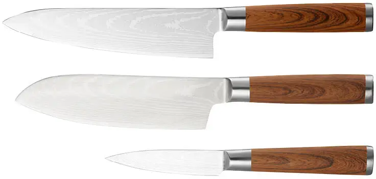 Med känslan av professionella kockknivar med fantastik stabilitet i handen och en härlig damaskusimitation kommer Yari i tre delar. Knivset består utav en kockkniv, en köttkniv och en skalkniv.