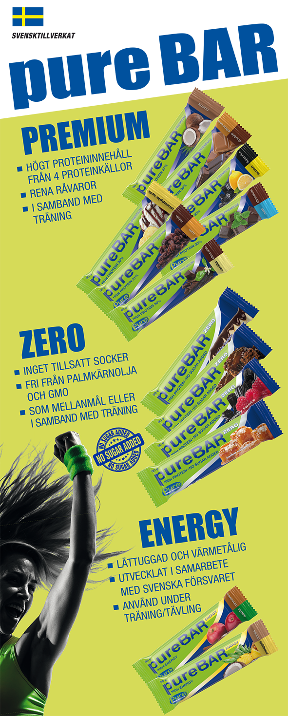 Basen i pureBAR PREMIUM innehåller fyra olika proteinkällor (vassleproteinisolat, mjölkprotein, mjölkprotein hydrolisat och äggviteprotein). Kolhydratkällorna som vi använder är fruktos och glykos som ger en bra återhämtning.